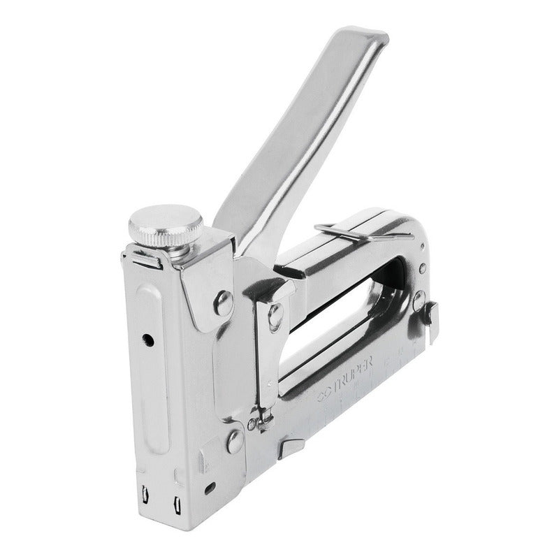 Engrapadora De Trabajo Medio Et-21, Fabricada en acero con acabado cromado, Mecanismo interno de acero al carbono templado, Uña posterior para quitar grapas, Perilla de ajuste de precisión USOS En aplicaciones industriales tales como tapicería, cojín de alfombras, forros, techos y trabajos livianos de exhibición ESPECIFICACIONES Medida de grapas: 1/4" (6.3 mm), 5/16" (7.9 mm) y 3/8" (9.5 mm) Empaque individual: Blister INCLUYE 1 Caja con 200 grapas de 5/16" (7.9 mm)