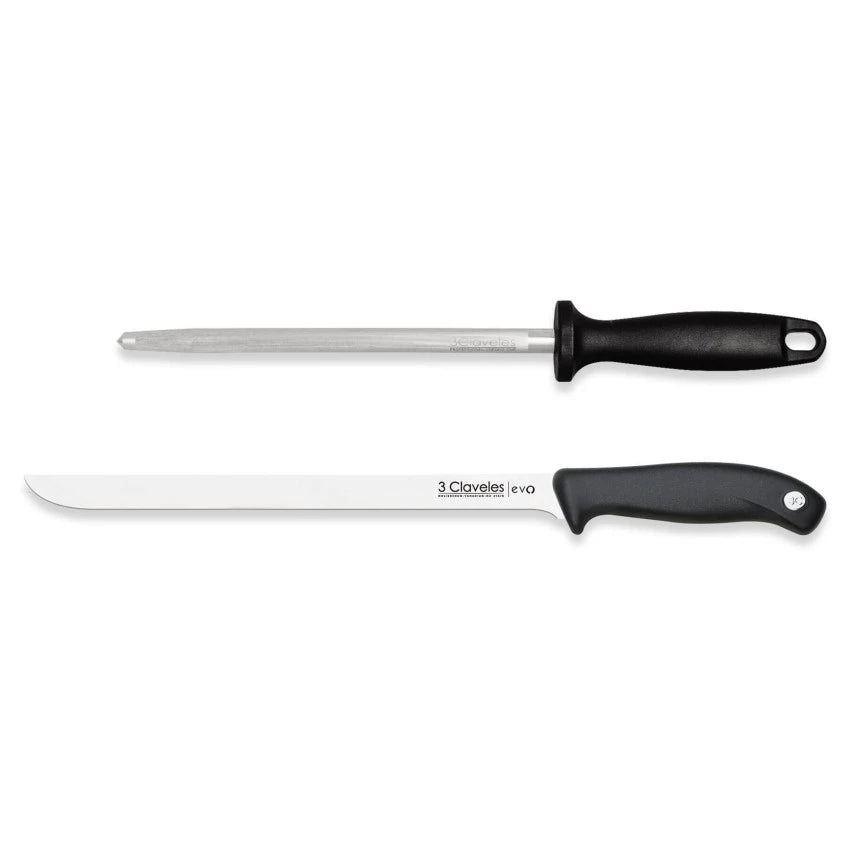 Juego de cuchillo jamonero y chaira 3 Claveles.