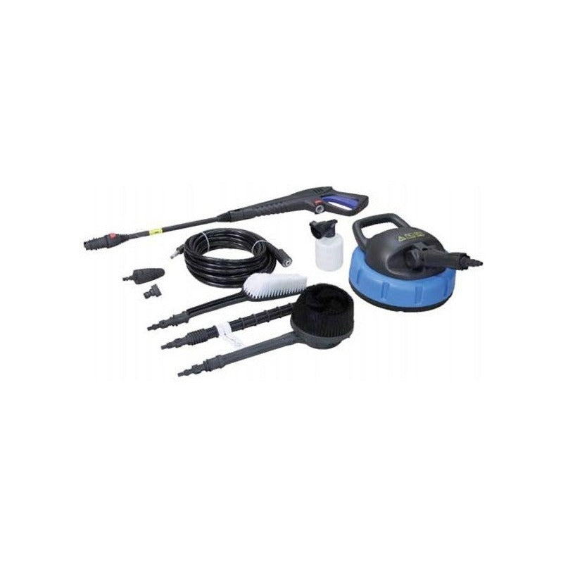Incluye manguera de 6 metros, Cabezal de aluminio de tres pistones con válvula de derivación incorporada. , Sistema de parada automática. AUTOMATIC STOP, El soporte lateral para el sitio de la lanza y la pistola se combinan (listos para usar)., Carro con asa ergonómica que otorga una excelente movilidad. , Pistola con conexión rápida. , Lanza con doble boquilla. , Cepillo fijo.