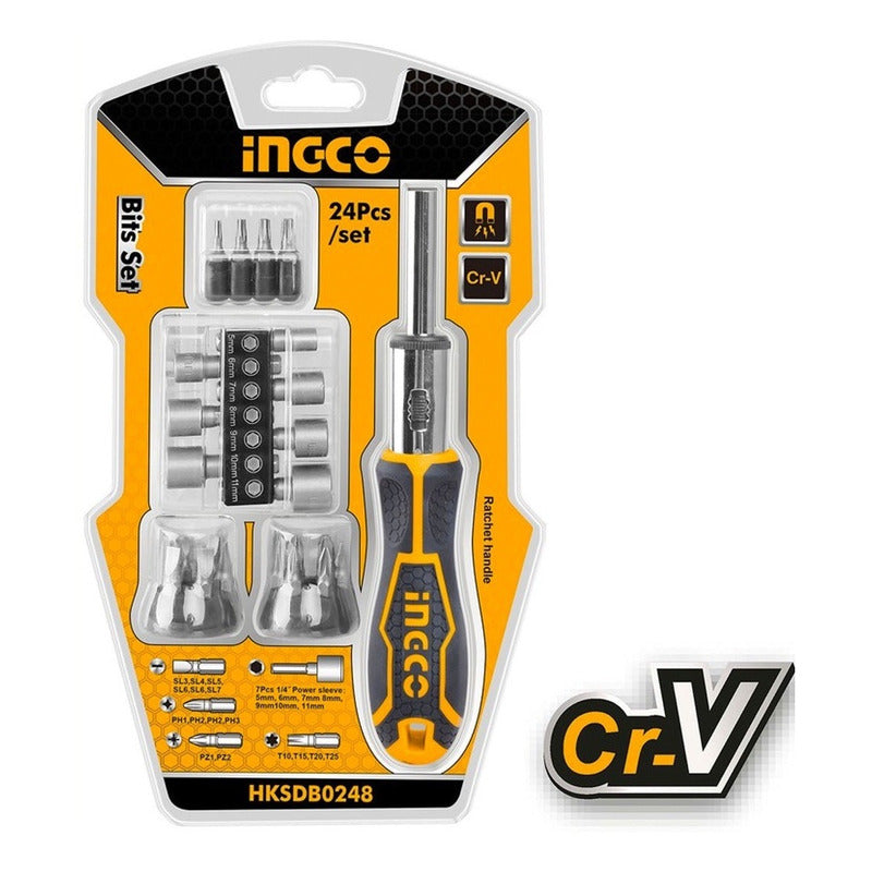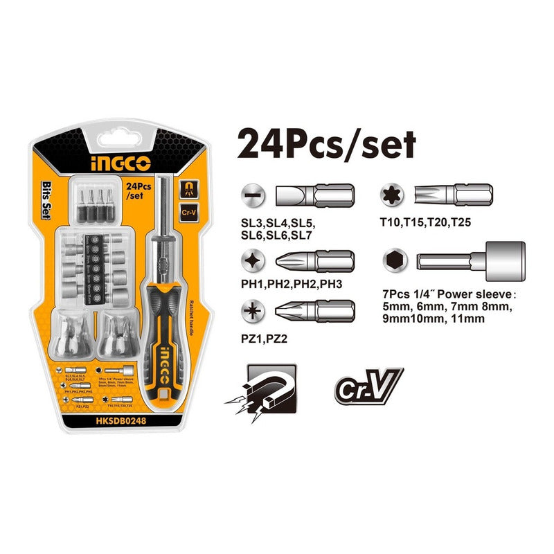 Destornillador industrial con puntas intercambiables 24 en 1, con mango plegable, ergonómico para trabajos en espacios reducidos y chicharra para mayor fuerza, ideal para trabajos mecánicos o de mantenimiento en general.